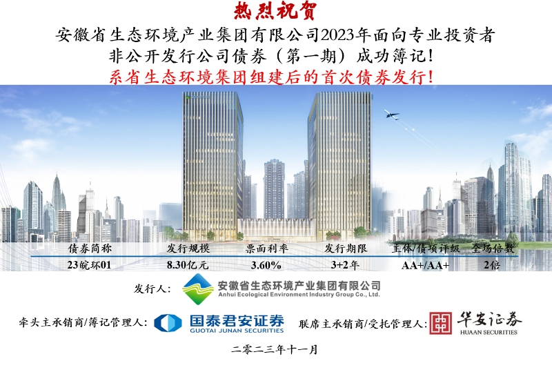 11月24日,省生態(tài)環(huán)境集團(tuán)首單非公開公司債券(債券簡(jiǎn)稱:23皖環(huán)01,債券代碼:253104.SH)在上海證券交易所成功簿記發(fā)行,本次債券由國(guó)泰君安、華安證券主承銷,募集金額8.3億元,期限3+2年,票面利率3.60%,圓滿完成集團(tuán)掛牌以后在資本市場(chǎng)的首次亮相。