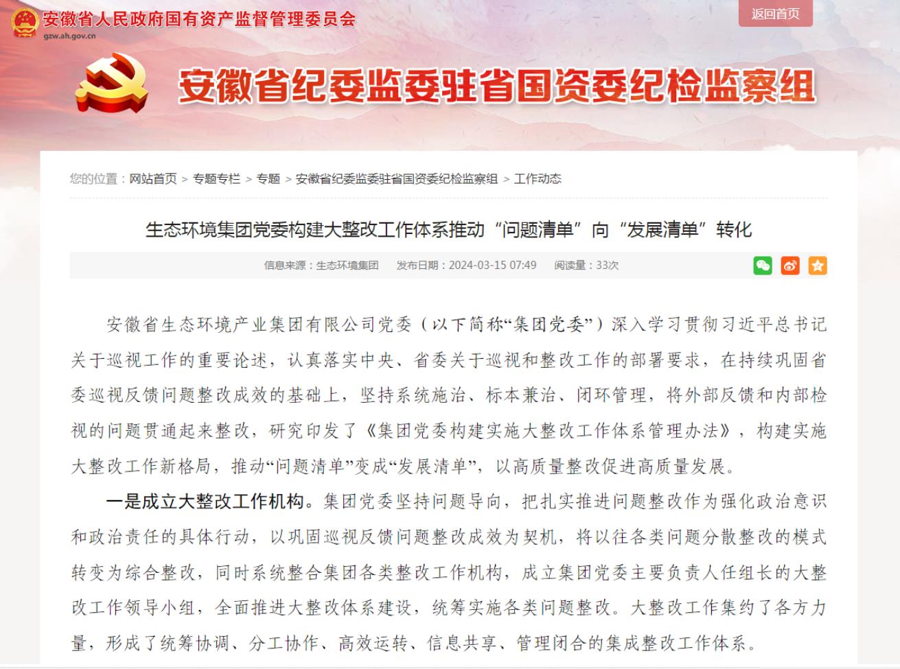近日,安徽省國資委網(wǎng)站-安徽省紀(jì)委監(jiān)委駐省國資委紀(jì)檢監(jiān)督組專欄發(fā)布了《省生態(tài)環(huán)境集團(tuán)黨委構(gòu)建大整改工作體系推動(dòng)“問題清單”向“發(fā)展清單”轉(zhuǎn)化》,以下為全文。