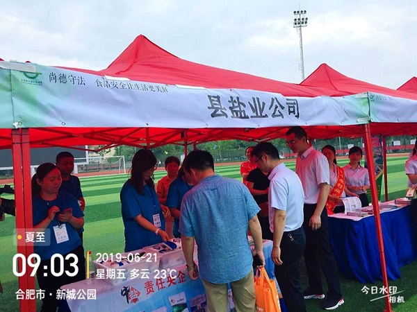 按照統(tǒng)一部署,6月21日早晨,長豐縣鹽業(yè)公司5名工作人員早早就來到了活動現(xiàn)場,帶著《食鹽專營辦法》等宣傳資料、品種鹽樣品及訂制的水杯參加宣傳活動。啟動儀式開始后,首先由縣政協(xié)副主席致辭;接著是合肥伊利乳業(yè)有限責(zé)任公司代表食品生產(chǎn)企業(yè)作承諾發(fā)言;最后由縣人大副主任宣布“長豐縣2019年食品安全宣傳周暨食品安全長豐行活動正式啟動”并會同場上領(lǐng)導(dǎo)共同按下儀式啟動球?;顒?/FONT>現(xiàn)場人群涌動,氣氛熱烈,長豐公司5名工作人員穿著統(tǒng)一T恤,佩戴著工作證,分別在兩個展臺開展宣傳。主要宣傳《食鹽專營辦法》、講解多品種鹽知識,推崇“吃好鹽 選中鹽”,吃鹽首選“綠色食品鹽”的健康理念。