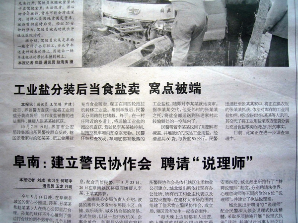 10月7日19時,界首市公安局磚集派出所民警接群眾反映,轄區(qū)張老家村的張某某,把工業(yè)用鹽充當(dāng)食鹽販賣,現(xiàn)正在用四輪拖拉機轉(zhuǎn)移工業(yè)鹽。接到舉報后,民警兵分兩路前往堵截。終于,在一村莊附近的鄉(xiāng)道上,將運輸工業(yè)鹽的拖拉機查獲,駕駛員李某某被控制,但拖拉機車廂內(nèi)卻空空無物。民警仔細檢查發(fā)現(xiàn),車廂底部有散落的工業(yè)鹽粒,隨即對李某某就地突審。據(jù)李某某交代,他受鄰村的張某某之托,將鹽全部運送到張老家村比較偏僻處的一空院內(nèi)了。