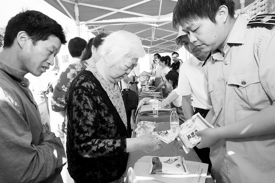 鹽政執(zhí)法人員向消費(fèi)者講解怎樣辨別真假食用碘鹽。5月15日是我國(guó)第18個(gè)“防治碘缺乏病日”,省有關(guān)部門在合肥舉行了宣傳活動(dòng)。(記者許昊攝)