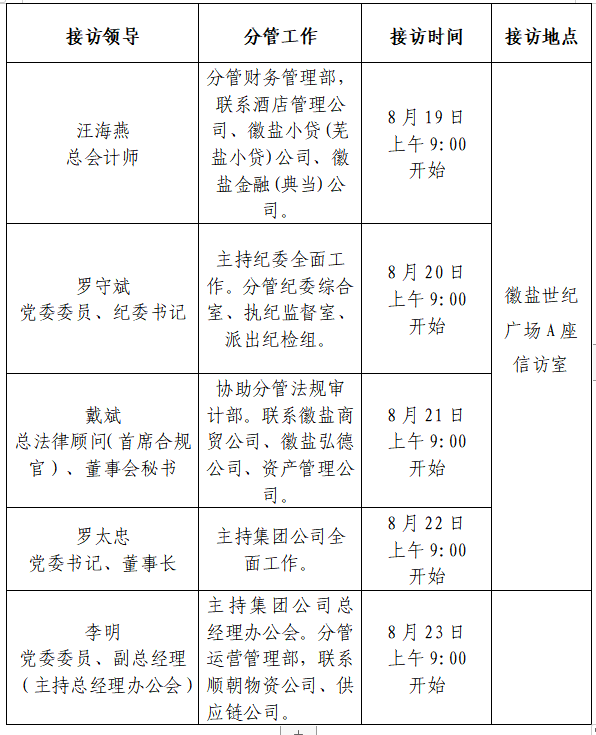 根據(jù)工作安排,現(xiàn)就省生態(tài)環(huán)境集團領導班子成員8月份接待群眾來訪安排公示如下: