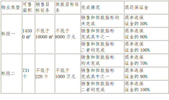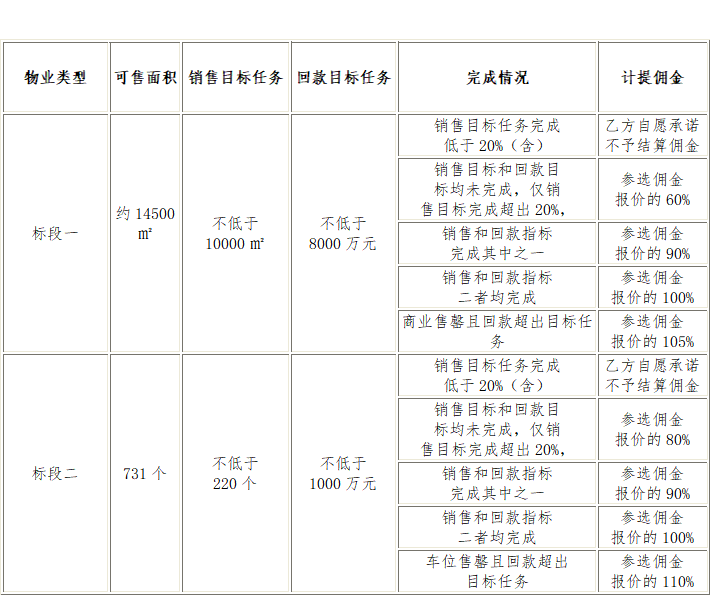 七、投標(biāo)限價(jià):本次比選文件中標(biāo)段一和標(biāo)段二所涉及的業(yè)態(tài)在合作期限、銷(xiāo)售完成目標(biāo)、回款目標(biāo)、分銷(xiāo)團(tuán)隊(duì)人員配備、傭金計(jì)提點(diǎn)數(shù)、以及履約保證金等設(shè)定了最低報(bào)價(jià)指標(biāo),低于此指標(biāo)的按廢標(biāo)處理。