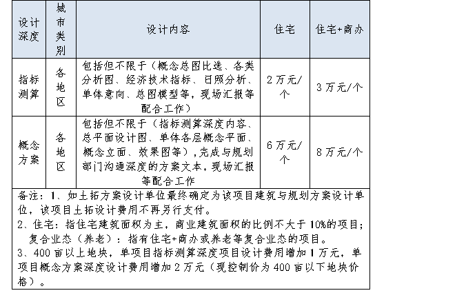 1.土拓方案設(shè)計(jì)費(fèi)用為單價(jià)包干價(jià),包括一切可能發(fā)生的費(fèi)用,不同業(yè)態(tài)的土拓方案設(shè)計(jì)費(fèi)如下表,參選人如中標(biāo),土拓方案設(shè)計(jì)費(fèi)用按照下表執(zhí)行。