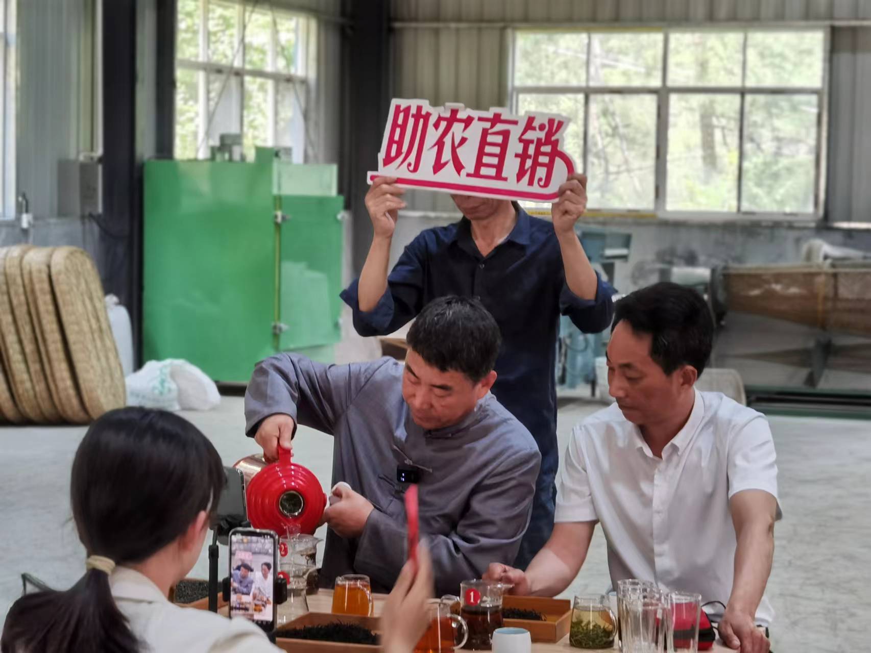 5月7日上午,安徽天方茶葉集團董事長鄭孝和先生一行受邀來到西河村集體茶廠云谷茶廠,介紹了天方茶葉集團助農(nóng)網(wǎng)上直銷茶葉方法和經(jīng)驗,并對云谷茶廠網(wǎng)上直銷茶葉進行了培訓和指導。上午11點,云谷茶廠室內(nèi)抖音直播銷售平臺正式上線,西河村駐村第一書記汪令富、村委負責人李運生同天方集團董事長鄭孝和帶著西河村生產(chǎn)的江北高山紅茶—天柱紅走進直播間,向網(wǎng)友們在線介紹了天柱紅的種植、采摘、品質(zhì)鑒別,經(jīng)過一個多小時的直播推介,銷售天柱紅紅茶近六千元。下午2點,網(wǎng)上直播助農(nóng)直銷茶葉活動改在茶園進行,通過實地高山茶園宣傳推介云谷茶廠生產(chǎn)的優(yōu)質(zhì)天柱紅紅茶和天柱玄月綠茶。