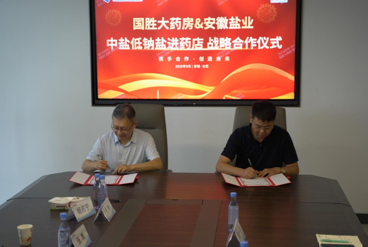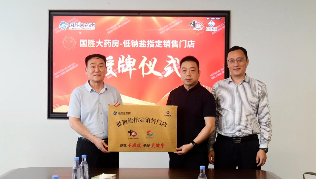 儀式現(xiàn)場,雙方圍繞“高鹽飲食危害防控”與“低鈉鹽全民推廣路徑”展開深入研討,達成了“政策同向、使命同頻”的戰(zhàn)略共識,共同致力于將健康干預(yù)覆蓋至家庭單元。隨后,安徽省鹽業(yè)集團與國勝大藥房簽署了戰(zhàn)略合作協(xié)議,安徽省鹽業(yè)集團與中鹽東興公司共同向國勝大藥房授予“中鹽低鈉鹽指定銷售門店”牌匾,宣告低鈉鹽的健康推廣與銷售在醫(yī)藥渠道正式啟動。
